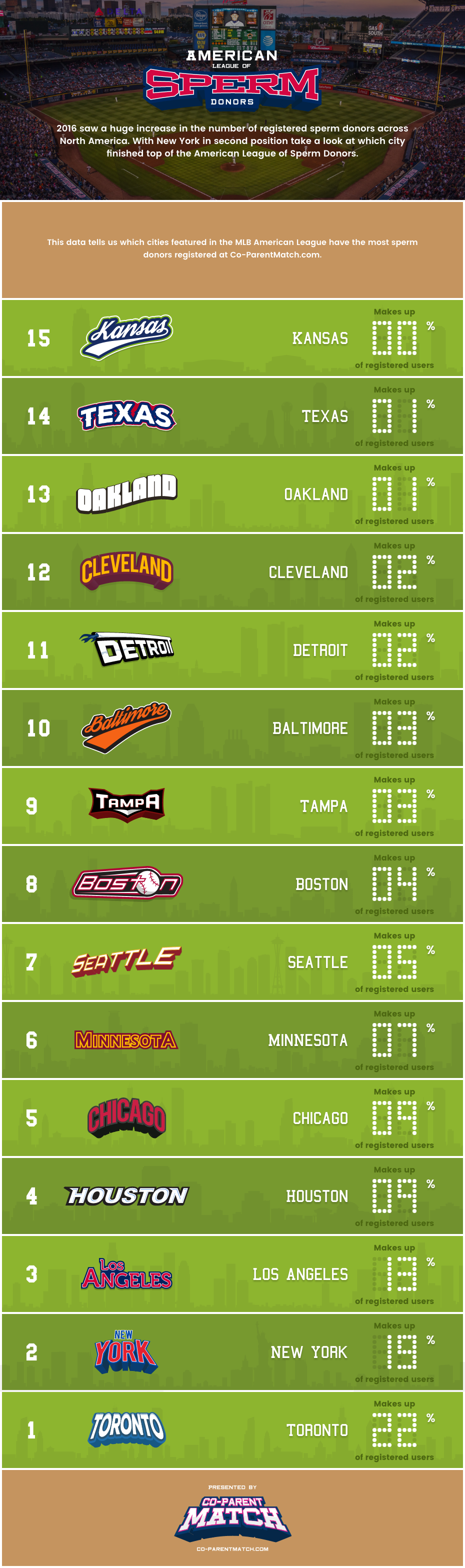 We decided to take a look at which cities, featured in the MLB American League, had the most sperm donors registered with Co-ParentMatch.com. With New York in second position take a look at which city finished top of the American League of Sperm Donors.