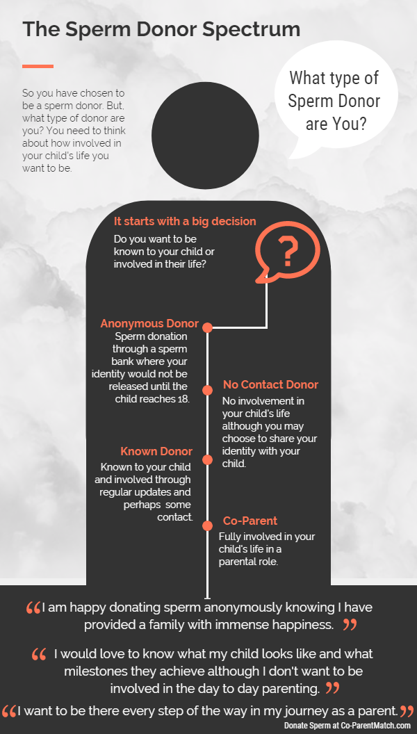 So you have chosen to be a sperm donor. But, what type of donor are you? You need to think about how involved in your child's life you want to be. The sperm donor spectrum runs from anonymous donors to full on co-parents.